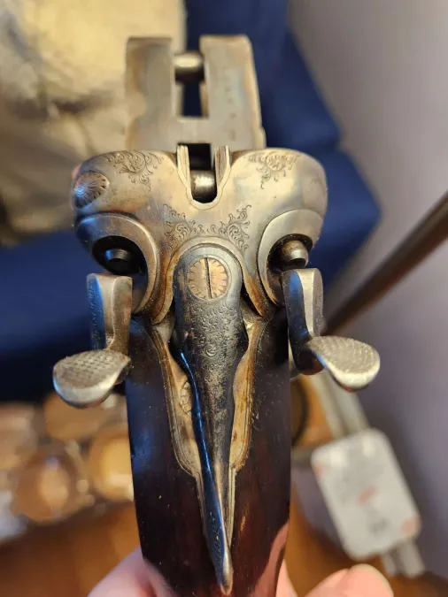Comes with heavy built browned Damascus barrels engraved with a band of stylized running foliage at the breech ends.