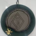 The dark green beret's badge is of the artillery component of the Belgian Army's Para Commando Regiment (now called the Special Operations Regiment). The inside is marked with the size (59), manufacturer's name (A.B.L. Cofabeba), and manufacturing date (1984). It is in excellent condition.