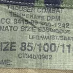 The Combat Trouser is in excellent unissued condition with all buttons present and a functional zipper. There is a small green manufacturer's tag to the inside of the back below the waist which indicates the size as 85cm for the leg, 100cm for the waist, and 116cm for the seat (the waist is approximately 38 inches and the inseam approximately 31.5 inches). The contract number of CT34b/0962 indicates a manufacturing date of anywhere between 1995 and 1997. The waist is adjustable via 2 waist adjustment tabs (adjustable via buttons) and a drawcord.