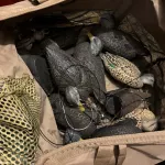 Decoys are like new all ready to go with weights on them 24-26 total black duck teal pin tail and widgion 3 goose shells and 2 cupped and committed goose flyer decoys and Avery goose flag all comes in a rig em right decoy bag along with a jerk string