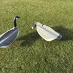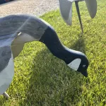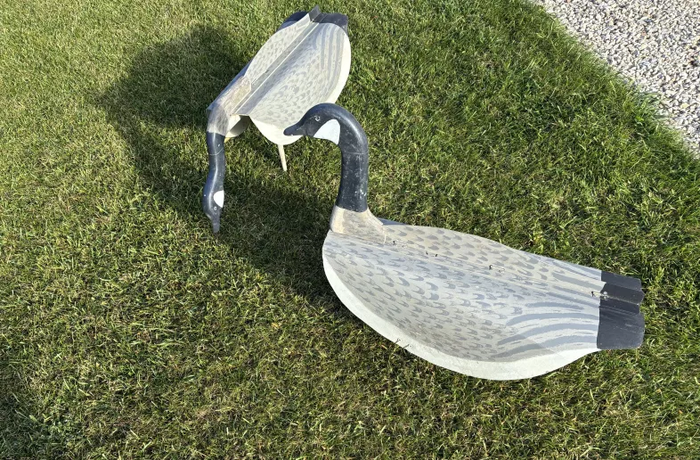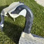 15 - Handmade by my father, painted goose decoys. Mid ‘40’s. Hours of labour carving heads & painting feathers on body. Decoys fold flat, have a centre folding spike. Heads slide onto main body after bodies are opened up & secured to spike. Some engineering going on here. Feeders & alert heads. $25 or discount for multiples. Man cave or cabin display. Conversation pieces.