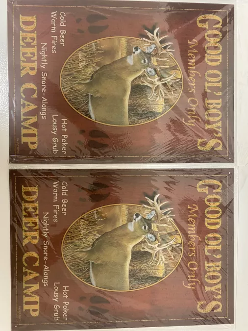 For sale are 6 unique hunting decor signs good for mancaves, hunt camps, trophy rooms, bedrooms and the likeness. There are 7 signs in total, two are duplicates. Never opened, still in the sealed plastic - 16" tall 11" wide.