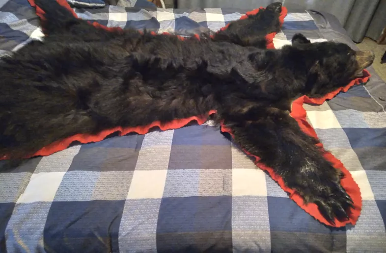 Black bear rug, to give you an idea of size the pic is taken on a queen size bed ph 204-738-2598 or text 701-540-7896