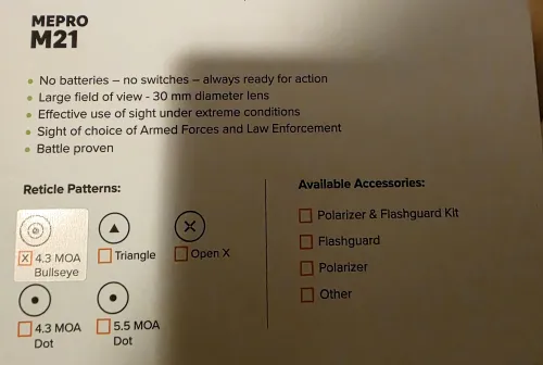 700.00 Brand new meprolight m21 with bullseye reticle and rem 21 illuminator Dec 5, 2025 - 7:34 PM Cdobbz Brand new meprolight m21 with bullseye reticle and rem 21 illuminator attached all new in box per