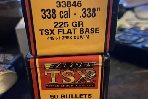 100.00 .338 caliber tsx Barnes bullets 225 gr Nov 18, 2025 - 10:19 PM hunter22 I am selling .338 caliber Barnes triple shock bullets I have 1 unopened boxes of and 1 with 20 bu