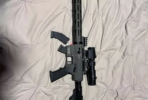 1000.00 Derya tm-22 attachments and ammo, Nov 16, 2025 - 3:14 PM eastcoasthunter Derya tm22, M-lok front rail, vortex red dot with magnifier, oversized charging handle, 45°