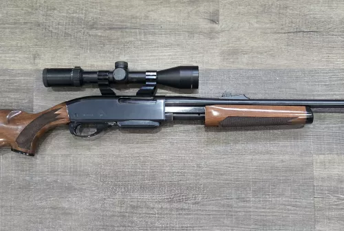 Remington 7600 chambered in 3006 with see thru rings and a bausch and lomb 3-9 x40 scope.
