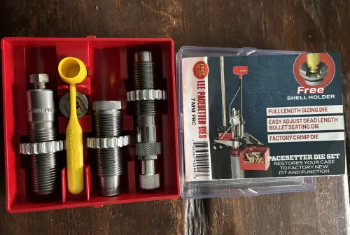 80.00 lee pace setter die set 7mmPRC Dec 3, 2025 - 7:33 AM franck koelsch Lee pace setter die set 7mm PRC complete with full lengh die , bullet seater collet e
