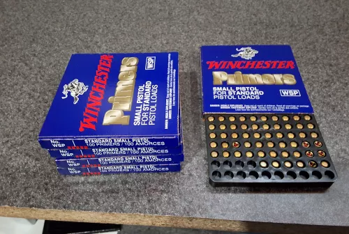 45.00 small pistol primers Oct 22, 2025 - 8:29 AM rm28gauge (400) Winchester small pistol primers one part box Winchester small pistol primers