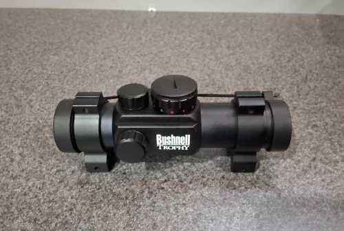 SOLD 70.00 Bushnell Trophy red dot scope Oct 22, 2025 - 8:35 AM rm28gauge Bushnell Trophy 1x28 red dot scope, like new c/w scope rings $70.00