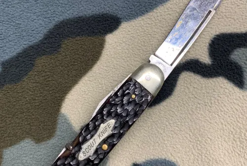 90.00 Vintage Scout Knife Dec 5, 2025 - 7:35 PM ColonelNate Vintage Scout Knife with three functions: blade, can opener, awl.