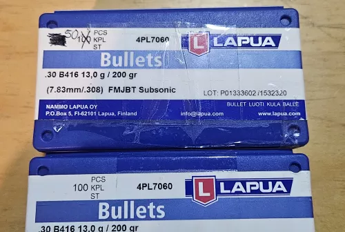 110.00 Lapua 30cal 200gr FMJBT Subsonic Nov 20, 2025 - 9:51 AM Rossel One full pack and the other has 50. Price includes shipping.