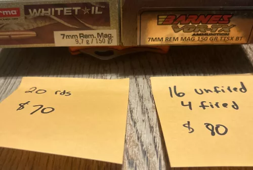 15.00 7mm RM Sep 13, 2025 - 1:16 PM Jon schwark 7mm RM. 40 nickel once fired. 34 brass once reloaded. Federal.