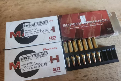 SOLD 80.00 223 rem Nov 5, 2025 - 6:22 AM Jpbt 2 brand new boxes of Hornady Match 75gr and 14 rounds of Hornady Superformance 55gr — $80, no shi