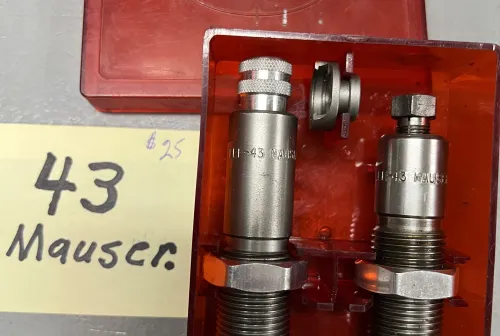 SOLD 25.00 LEE .43 MAUSER 2 DIE SET- W/#18 Shell Holder Dec 4, 2025 - 7:59 AM bulletcaster75 Item is from an estate sale. In very good condition.