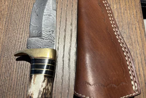 200.00 Custom Damascus Hunting Knife Nov 19, 2025 - 5:08 PM interlakeshooter Custom forged damascus knife with antler / brass handle and leather sheath.
