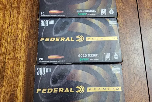45.00 Federal Premium Gold Medal 308 Win 168gr Sierra Match King BTHP Oct 19, 2025 - 9:10 PM MicMac_707 3 boxes of Federal Premium Gold Medal Sierra MatchKing 308 Win 168gr BTHP.