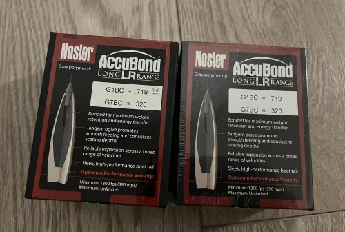 180.00 Nosler Accubond Long Range 6.5 Cal 142 grain bullets Nov 3, 2025 - 11:26 AM BJCL818386 Nosler Accubond Long Range 6.5 cal 142 grain bullets 1 sealed box of 100