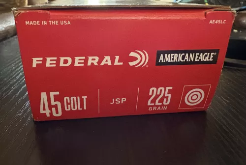 90.00 45 colt federal American Eagle 225gr JSP Nov 25, 2025 - 10:02 AM Cookiez009 1 box of American Eagle 45 colt 225 grain Jacketed Soft Point.