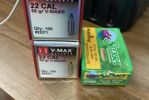 SOLD 100.00 22 Cal bullets (Hornady & Sierra) - Price Drop Dec 5, 2025 - 7:47 AM Goosehunter82 I have 2 boxes (200) of Hornady V-Max 55gr and 1 box (100) Sierra MatchKing 69gr HPBT