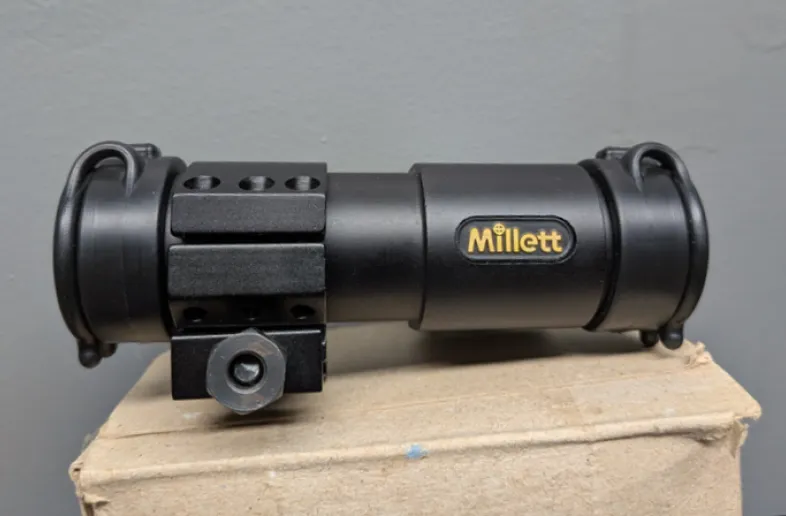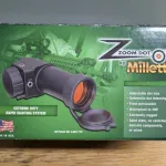 For sale is a complete-in-box MILLETT ZoomDot red dot sight.