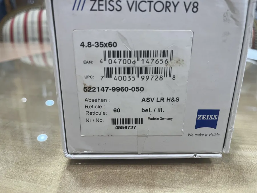 You are looking at the best of Zeiss ever made in their history, it's a Zeiss V8 4.8-35x60 Ret # 60 which is the best ret, has the ASV Elevation and Windage Turrets ,ASV Windage is an option on these scopes, Honestly scope was only mounted on a rifle never left home so its in new condition , I got 8 of them Sold the rifle so this one is excess to my needs , comes with original box all paper work and 9 ASV turret rings everything as came in new, Firm Price will ship for an additional $40, NO Trades only downsizing, serious inquires please