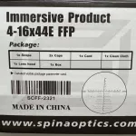Once installed on a rifle and never used outside, Spina Optics Rifle Scope 4-16X44E FFP (First Focal Plane). Fog, shock and water proofed, with red and green Illumination and 100 Yards Parallax Adjustment, pull up windage and elevation adjustors lens covers, adjusting wheel, sunshade and pair of 11mm dovetail mounts.