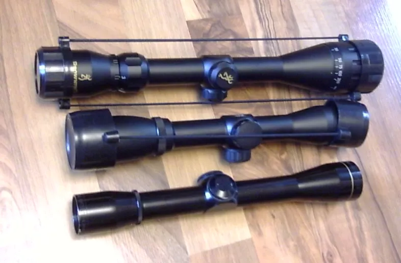 Browning 3x9x40, is $150 The middle one is a Cabelas pine ridge rimfire 4x32 ,$40.00 Next one is Leupold M8 6 power compact $200 .00 shipped All look in nice condition Not many marks at all