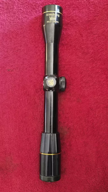 POST WITH CROSSHAIR RETICLE, 1"TUBE, GOLD CROWN MODEL JAPAN QUALITY, CLICK ADJUSTMENTS, NUMEROUS HANDLING MARKS ON BODY NO MARKS ON COATED LENSES CLEAR BRIGHT SHARP, PERFECT BUSH HUNTING SCOPE