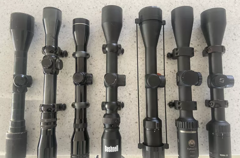 Eight rifle scopes and various scope rings priced to sell! From left to right: