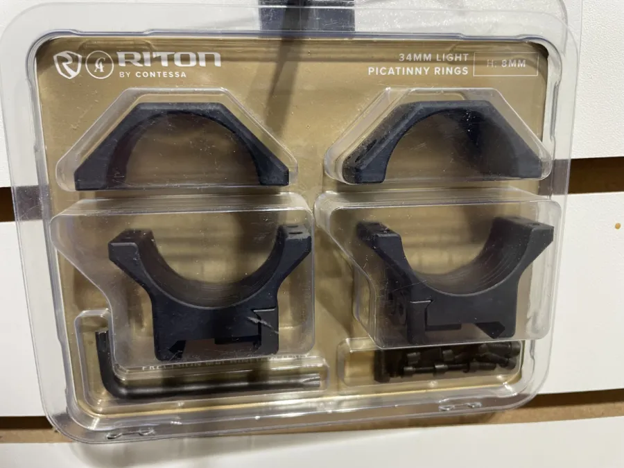 New Riton scope rings 34 mm available in 8 mm height and in 12 mm high. Shipping available.