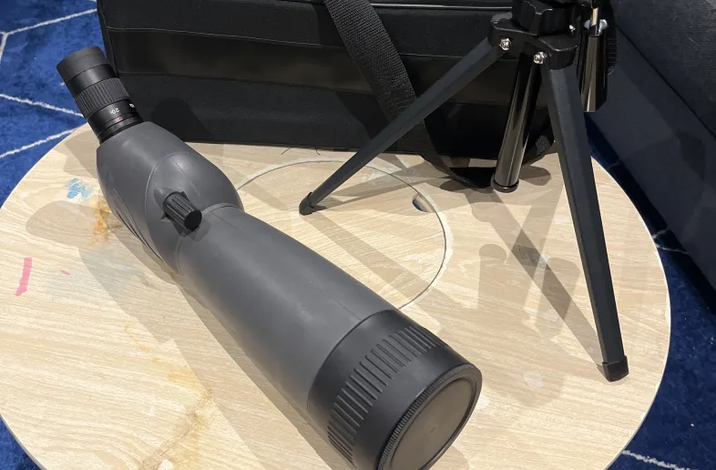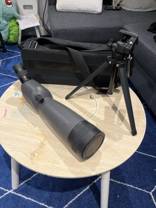 20-60x60mm spotting scope. Image is decent, and condition is good. Comes with a bag and tripod (for table).