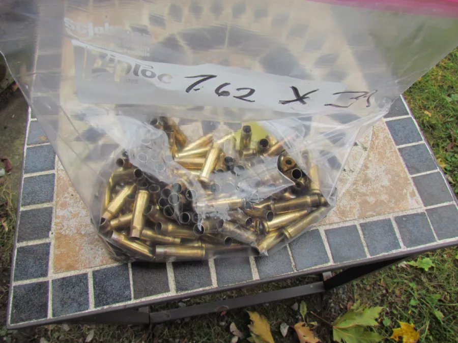 One hundred & twelve (112) 7.62x39 once-fired brass casings with PMC, Federal or MFS head stamps. (No steel casings.) Cases have been tumble-polished, and de-primed. $12. - SOLD