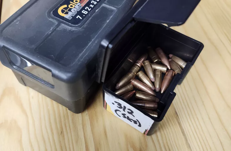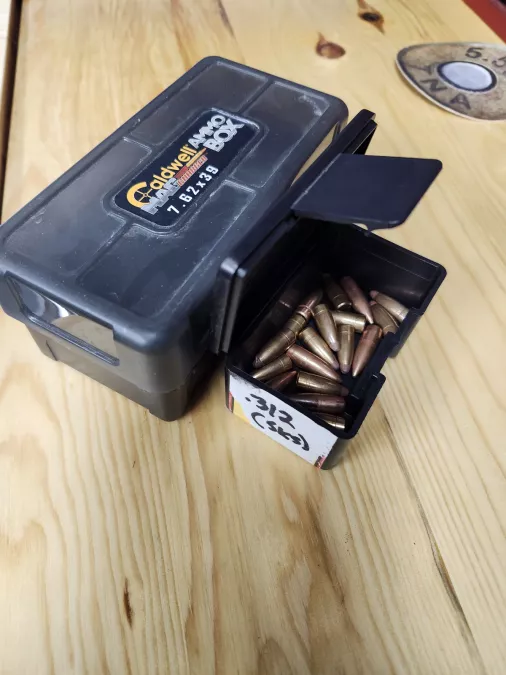 I have a 7.62x39 ammo box and 19 pulled bullets .312 diameter, could be used for .303 brit reloading