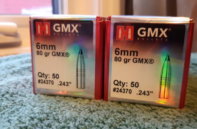 Selling two sealed boxes of Hornady GMX 80gr .243 bullets. Same lot number.