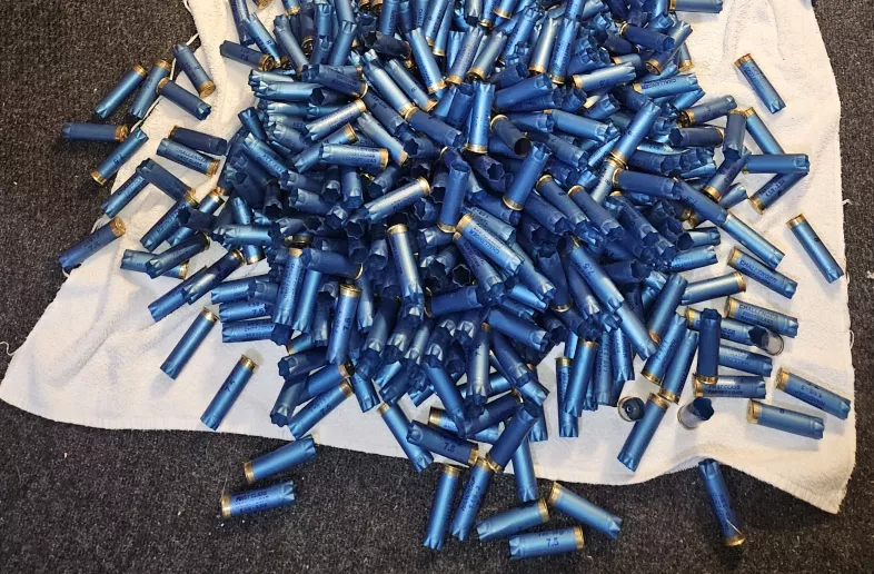 Lot. Of 12 gauge First Class Challenger hulls for reloading. Blue Plastic Hulls. Already Cleaned