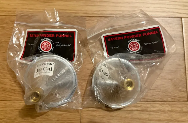 Satern Aluminum Powder Funnels. 6.5mm and 30 cal. Brand new in packaging.