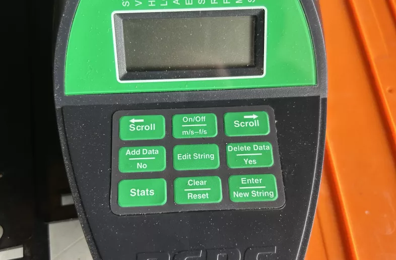 RCBS chronograph. It works but I did clip it once. The triangle pieces can’t go on now because the stand part is shot (literally)