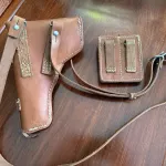 This is an original Chinese Type 54 pistol holster set, issued for the 7.62×25mm Tokarev-pattern sidearm widely used by the People’s Liberation Army. Constructed from natural brown leather with reinforced stitching, this set includes the holster, double magazine pouch, and shoulder strap, making it complete for both carry and display.
