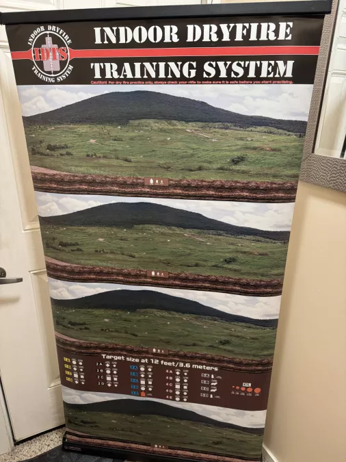 I have a Indoor Dryfire Training System. This kit comes with a retractable and portable roll up banner that you will install at a distance of approximately 12 feet (depends of scope model). Four identical range set at different height to practise multiple positions from prone to standing and everything in between.
