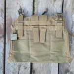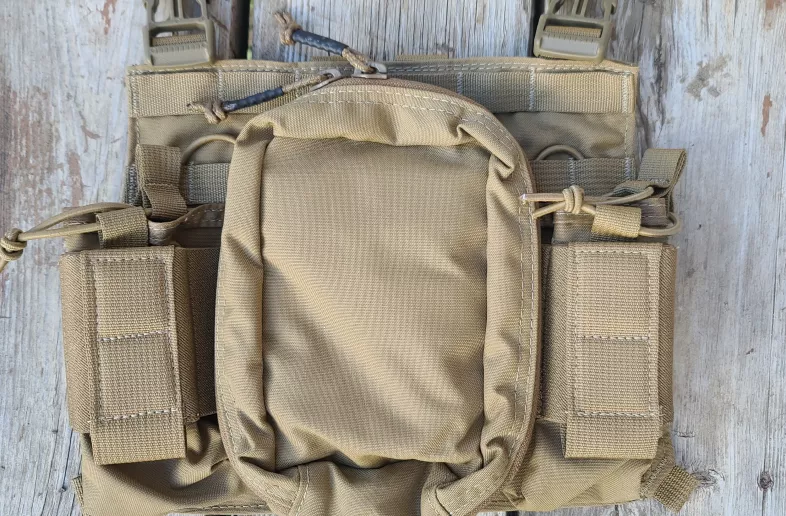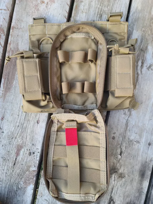Placard/front flap allowing the user to carry at least 2 rifle magazines, 2 pistol magazines, and a stocked IFAK. Because of the bungees you can fit multiple different intermediate cartridge magazines or other items (up to 2 per side if AR-pattern magazines), pistol pouches use magnetic retention.
